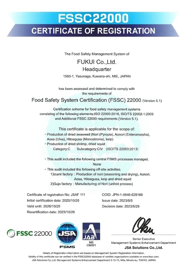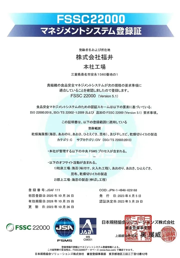 株式会社福井還於2020 年 10 月取得了 FSSC 22000 認證,在生産線上引進了金屬檢測機和 X 光異物檢測機,並在製作工序裡加入色選機和磁選機,減少在紫菜中出現異物的情況。 除了使用機器,生產過程仍保留了人手目視的檢查,以確保產品達到最高的品質。